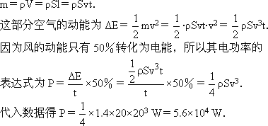 新疆达坂城风口的风速约为v=20 m/s,设该地空气的密度为ρ=1.4 kg/m3,若把通过横截面积S=20 m2的风的 动能的50%转化为电能,使推导利用上述已知量计算电功率的公式,并求出发电机电功率的大小.