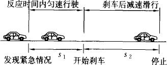 分析:从后车的运动考虑,造成“追尾”的原因主要有以下几方面:(1)车速过快;(2)跟前车的车距过小;(3)司机的反应较迟缓;(4)车的制动性能较差. 当司机发现紧急情况(如前方车辆突然停下)后,在反应时间内,汽车仍以原来的速度做匀速直线运动;刹车后,汽车匀减速滑行.所以,刹车过程中汽车先后做着两种不同的运动,行驶中的安全车距应等于两部分位移之和.其运动情况如图所示.为确保安全行车,反应时间应取0.7 s计算. |