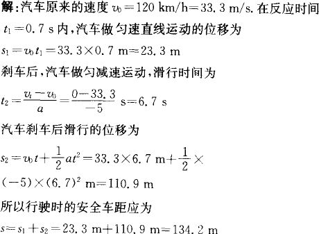 在高速公路上,有时会发生“追尾”的事故——后面的汽车撞上前面的汽车.请分析一下,造成“追尾”事故的原因有哪些?我国高速公路的最高车速限制为120 km/h.设某人驾车正以最高时速沿平直高速公路行驶,该车刹车时产生的加速度大小为5 m/s2,司机的反应时间(从意识到应该停车至操作刹车的时间)为0.6 s~0.7 s.请分析一下,应该如何计算行驶时的安全车距?
