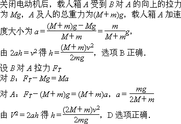 如图是一种升降电梯的示意图,A为载人箱,B为平衡重物,它们的质量均为M,上下均由跨过滑轮的钢索系住,在电动机的牵引下使电梯上下运动.如果电梯中人的总质量为m,匀速上升的速度为v,电梯即将到顶层前关闭电动机,依靠惯性上升h高度后停止,在不计空气和摩擦阻力的情况下,h为