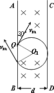 如图所示,在空间中存在垂直纸面向里的场强为B匀强磁场,其边界AB、CD的宽度为d,在左边界的Q点处有一质量为m,带电量为负q的粒子沿与左边界成30°的方向射入磁场,粒子重力不计.求: