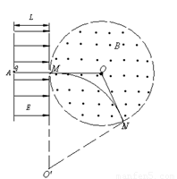 ÈçͼËùʾ£¬¿Õ¼ä·Ö²¼×Å·½ÏòƽÐÐÓÚÖ½ÃæÇÒÓë³¡Çø±ß½ç´¹Ö±µÄÓнçÔÈÇ¿µç³¡£¬µç³¡Ç¿¶ÈΪE¡¢³¡Çø¿í¶ÈΪL¡£ÔÚ½ô¿¿µç³¡ÓÒ²àµÄÔ²ÐÎÇøÓòÄÚ£¬·Ö²¼×Å´¹Ö±ÓÚÖ½ÃæÏòÍâµÄÔÈÇ¿´Å³¡£¬´Å¸ÐӦǿ¶ÈBδ֪£¬Ô²Ðδų¡ÇøÓò°ë¾¶Îªr¡£Ò»ÖÊÁ¿Îªm¡¢µçºÉÁ¿ÎªqµÄ´øÕýµçµÄÁ£×Ó´ÓAµãÓɾ²Ö¹Êͷźó£¬ÔÚMµãÀ뿪µç³¡£¬²¢Ñذ뾶·½ÏòÉäÈë´Å³¡ÇøÓò£¬È»ºó´ÓNµãÉä³ö£¬OΪԲÐÄ£¬¡ÏMON£½120¡ã£¬Á£×ÓÖØÁ¦¿ÉºöÂÔ²»¼Æ¡£Çó£º