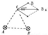 解答:解:根据安培定则可知,导线A在C处产生的磁场方向垂直于AC方向向右,导线B在C处产生的磁场方向垂直于BC方向向右,则磁场在C处相互叠加,