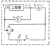 某实验小组根据描绘小灯泡伏安特性曲线的实验方法,探究晶体二极管在正向电压下的I-U特性。所用的器材包括:二极管,电源E,电流表A,电压表V,滑动变阻器R,开关S,导线若干。![]()