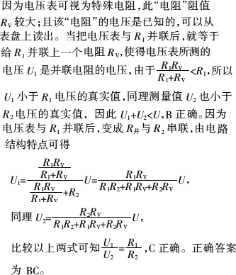 阻值较大的电阻R1和R2串联后,接入电压U恒定的电路,如图所示,现用同一电压表依次测量R1与R2的电压,测量值分别为U1与U2,已知电压表内阻与R1、R2相差不大,则
