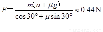 如图所示,质量为0.5kg的物体在与水平面成300角的拉力F作用下,沿水平桌面向右做直线运动,经过0.5m的距离速度由0.6m/s变为0.4m/s,已知物体与桌面间的动摩擦因数μ=0.1,求作用力F的大小。(g=10m/s2)![]()