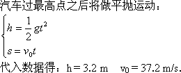 在一次飞车过黄河的表演中,汽车在空中飞过最高点后,在对岸着地.已知汽车从最高点至着地点经历的时间约为0.8 s,两点间的水平距离约为30 m,忽略空气阻力,则最高点与着地点的高度差约为________m,汽车在最高点时的速度约为________m/s.(取g=10 m/s2)