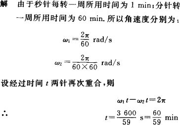思路与技巧:解该题时,不少同学简单认为只要秒针转一圈,则分针与秒针就第二次重合,而忽视了在这段时间分针也要转过一个角度.考虑到分针和秒针的同时运动,当第二次重合时,它们转过的角度应相差2kπ. 由公式 |
