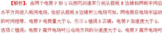 (2012河南商丘模拟)带有等量异种电荷的平行金属板M、N水平放置,两个电荷P和Q以相同的速率分别从极板M边缘和两板中间沿水平方向进入板间电场,恰好从极板N边缘射出电场,如图所示。若不考虑电荷的重力和它们之间的相互作用,下列说法正确的是