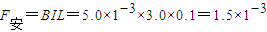 解答:解:(1)导体棒长为L=0.1m,磁感应强度5.0×10-3T,电流为3.0A,并且导体棒和磁场垂直,
