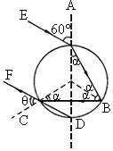 根据折射定律: α =30°,∠COD=60°根据折射光路的可逆性θ=60°,所以∠OCD=60°,在△COD中,∠ODC=60°,所以EA∥FC,则两光线的夹角为180°. |