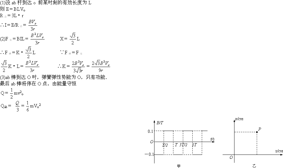 如图所示,MN、PQ是相互交叉成60°角的光滑金属导轨,O是它们的交点且接触良好.两导轨处在同一水平面内,并置于有理想边界的匀强磁场中(图中经过O点的虚线即为磁场的左边界).导体棒ab与导轨始终保持良好接触,并在弹簧S的作用下沿导轨以速度vo向左匀速运动.已知在导体棒运动的过程中,弹簧始终处于弹性限度内.磁感应强度的大小为B,方向如图.当导体棒运动到O点时,弹簧恰好处于原长,导轨和导体棒单位长度的电阻均为r,导体棒ab的质量为m.求: