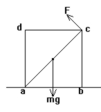 在水平地面上放着一只质量均匀分布的方形木箱abcd, 边长为L, 质量为m, 今欲用一推力将木箱以a为支点翻倒如图所示. 则为推起木箱所需的最小推力为______mg, 要使木箱刚能翻倒, 推力所作的功至少为______mgL. (都保留小数点后两位)