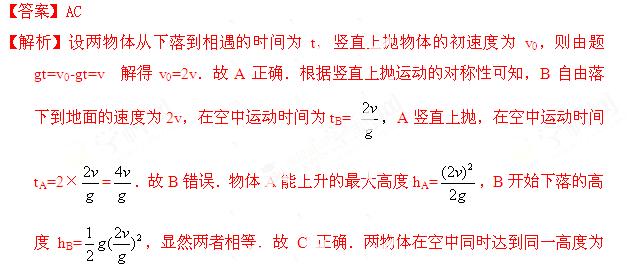 (2013云南玉溪一中质检)从地面竖直上抛一物体A,同时在离地面某一高度处有一物体B自由下落,两物体在空中同时到达同一高度时速度大小均为v,则下列说法正确的是 ( )