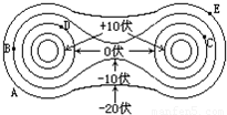 解答:解:(1)根据等势面的分布可以知道,从里向外电场的电势是降低的,所以电场的电场线都应该是向外的,所以两个圆柱体带的都是正电荷.