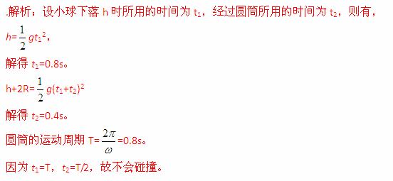 rad/s,桶壁上P处有一小圆孔,桶壁很薄,桶的半径R=2m,当圆孔正上方h=3.2m处有一小球由静止开始下落,已知圆孔的半径略大于小球的半径,试通过计算判断小球是否会和圆筒碰撞(空气阻力不计,g取