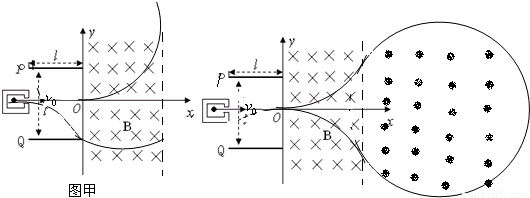 如图甲所示,建立xoy坐标系,两平行极板P、Q垂直于y轴且关于x轴对称,极板长度和板间距均为l,第Ⅰ、Ⅳ象限有一宽度一定的匀强磁场,方向垂直于xoy平面向里.位于极板左侧的粒子源沿x轴向右连续发射质量为m、电量为+q、速度相同、重力不计的带电粒子.在0~4t时间内两板间加上如图乙所示的电压(不考虑极板边缘的影响).已知t=0时刻进入两板间的带电粒子恰好在t时刻经极板边缘射入磁场.上述m、q、l、t、B为已知量.(不考虑粒子间相互影响及返回板间的情况)