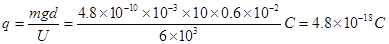 平行金属板水平放置,板间距为0.6cm,两板接上6×103V电压,板间有一个带电液滴质量为4.8×10-10 g,处于静止状态,则油滴上有元电荷数目是(g取10m/s2) ( )