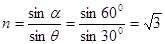 试题分析:由光路图可知,光线射到AB面上的入射角а=600,折射角θ=300,根据折射定律