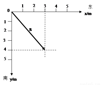 一个物体先向正南方向运动4m,接着向正东方向运动3m到达终点,请在二维坐标系中表示出该物体的位移,并求出位移的大小。