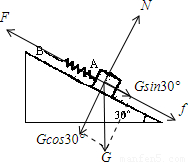 如图所示,弹簧AB原长为35cm,A端挂一个重50N的物体,手执B端,将物体置于倾角为30°的斜面上.当物体沿斜面匀速下滑时,弹簧长度为40cm;当物体匀速上滑时,弹簧长度为50cm,试求:(1)弹簧的倔强系数;