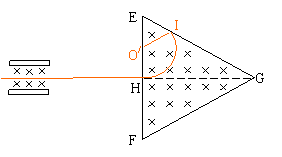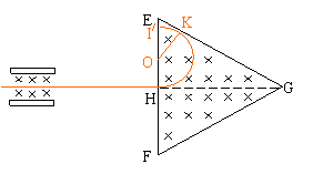 ʽÖУ¬rÊÇÀë×Ó¼××öÔ²ÖÜÔ˶¯µÄ°ë¾¶¡£Àë×Ó¼×Ôڴų¡ÖеÄÔ˶¯¹ì¼£Îª°ëÔ²£¬Ô²ÐÄΪO£ºÕâ°ëÔ²¸ÕºÃÓëEG±ßÏàÇÐÓÚK£¬ÓëEF±ß½»ÓÚI/µã¡£ÔÚ¦¤EOKÖУ¬OK´¹Ö±ÓÚEG¡£