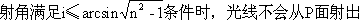 [评析]同一个初始条件可能有若干个不同结果.这是对考生思维能力的考查.本题中,当光线射到M上,发生折射.以A为分界点,入射点在AC之间,光线先要到达P界面,所以一定先要讨论光线在P界面上的行为.光线在P界面一定会发生反射现象,是否发生折射要看入射角是否大于临界角.由于此问题与本题无关所以可以不讨论它.如果试题提出光线在P界面的行为时,就要认真讨论.结论是:入射到M面光线的入 |