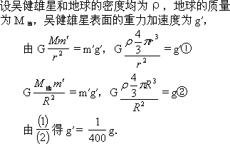 1990年5月,紫金山天文台将他们发现的第2752号小行星命名为吴健雄星,该小行星的半径为16 km.若将此小行星和地球均看成质量分布均匀的球体,小行星的速度与地球相同.已知地球半径R=6 400 km,地球表面重力加速度为g,这个小行星表面的重力加速度为