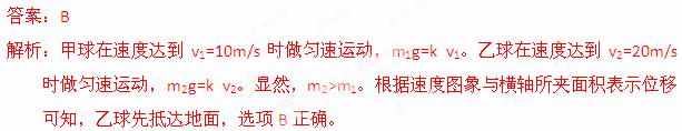 (2013安徽省蚌埠市一模)甲、乙两球从同一高度同时由静止释放,两球在抵达地面前,下落时受到的空气阻力F与球的速度v成正比,即F=-kv(k>0),且两球的比例常数k相等。图为下落时两球的“速度-时间”关