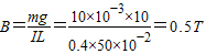 解答:解:(1)由题可知 F安=mg 即 BIL=mg