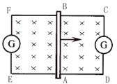 CDEF是金属框.当导体 AB向右移动时,试应用楞次定律确定ABCD和ABFP:两个电路中感应电流的方向.我们能不能用这两个电路中的任意一个来判定导体 AB中感应电流的方向?![]()