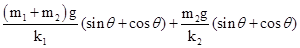 如图所示,倾角为θ的光滑斜面ABC放在水平面上,劲度系数分别为k1、k2的两个轻弹簧沿斜面悬挂着,两弹簧之间有一质量为m1的重物,最下端挂一质量为m2的重物,此时两重物处于平衡状态,现把斜面ABC绕A点在同一平面内缓慢地顺时针旋转90°后,重新达到平衡.试求m1、m2分别沿斜面移动的距离。
