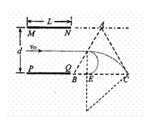 如图所示,两块平行金属板MN、PQ水平放置,两板间距为d、板长为L,在紧靠平行板右侧的等边三角形区域内存在着匀强磁场,磁场方向垂直纸面向里,三角形底边BC与PQ在同一水平线上,顶点A与MN在同一水平线上。一个质量为m、电量为+q的粒子沿两板中心线以初速度v0水平射入,若在两金属板间加某一恒定电压,粒子离开电场后垂直AB边从D点进入磁场,BD=