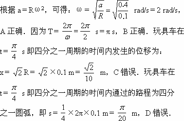 玩具车在圆形轨道上做匀速圆周运动,半径R=0.1 m,向心加速度的大小为a=0.4 m/s2,则下列说法正确的是