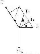 解:以小球为研究对象,分析受力:重力、a、b两绳的拉力T1、T2.根据平衡平衡条件得知,T1和T2的合力方向竖直向上,大小与重力相等,保持不变,作出b绳在三个不同位置时,两个拉力的变化,如图,可图得到,T1=T3>T2.