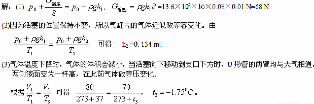 一足够高的直立气缸上端开口,用一个厚度不计的活塞封闭了一段高为80 cm的气柱,活塞的横截面积为0. 01 m2,活塞与气缸间的摩擦不计。气缸侧壁通过一个开口与U形管相连,开口离气缸底部的高度为70 cm,开口管内及U形管内的气体体积忽略不计。已知图所示状态时,气体的温度为7 0C , U形管内水银面的高度差h1= 5cm。大气压强p0 =1. 0×105 Pa保持不变。水银的密度ρ=13. 6×103 kg/m3。