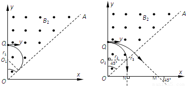 (2)要使离子都不能打到x轴上,那么粒子最大的半径应该与虚线OA相切,有几何关系即可求得磁感应强度的大小;