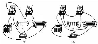 图中甲、乙是两组同样的器材实物图,用来测量待测电阻R的阻值,每组器材中包括:电键、电池、变阻器、电流表、电压表、待测电阻R、若干导线.