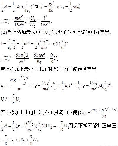 (2)为使带电粒子经U1加速后,沿中心线射入两金属板,并能够从两板之间射出,两水平金属板所加电压U2应满足什么条件?