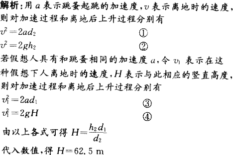 原地起跳时,先屈腿下蹲,然后突然蹬地.从开始蹬地到离地是加速过程(视为匀加速),加速过程中重心上升的距离称为“加速距离”.离地后重心继续上升,在此过程中重心上升的最大距离称为“竖直高度”.现有下列数据:人原地上跳的“加速距离”d1=0.50 m,“竖直高度”h1=1.0 m;跳蚤原地上跳的“加速距离”d2=0.000 80 m,“竖直高度”h2=0.10 m.假想人具有与跳蚤相等的起跳加速度,而“加速距离”仍为0.50 m,则人上跳的“竖直高度”是多少?