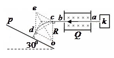(18分)如图所示,k是产生带电粒子的装置,从其小孔a水平向左射出比荷为1.0×l03C/kg的不同速率的带电粒子,带电粒子的重力忽略不计.Q是速度选择器,其内有垂直纸面向里的磁感应强度为3.0×l0-3T的匀强磁场和竖直方向的匀强电场(电场线未画出).![]()