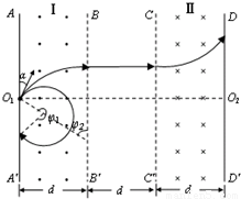 (2)当粒子速度为v时,粒子在区域I内的运动轨迹刚好与BB′边界相切,根据几何关系得出粒子运动的半径,再根据粒子在匀强磁场中运动的半径公式求出v 的大小.当粒子速度为v1时,刚好垂直边界BB′射出区域Ⅰ.根据几何关系得出粒子的半径,再根据粒子在匀强磁场中运动的半径公式求出v1 的大小.