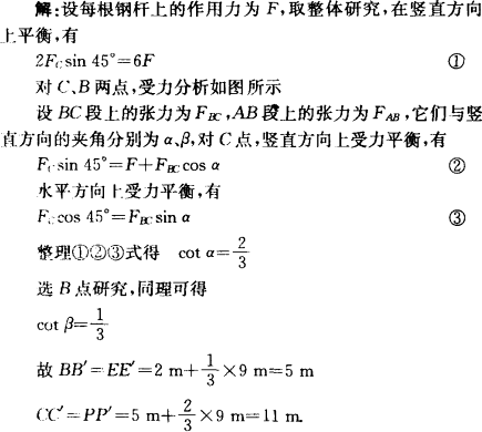 分析:这是一个实际应用题,可从整体角度讨论FC与每根钢杆上的力F之间的关系.为求每根钢杆的长度,可取A、B、C三点,利用共点力平衡条件求出BC、AB与竖直方向的夹角.