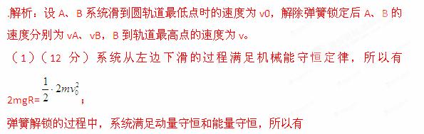 (2013年2月广东省名校质检)如图所示,A、B两球质量均为m,之间有压缩的轻短弹簧处于锁定状态。弹簧的长度、两球的大小均忽略,整体视为质点,该装置从半径为R的竖直光滑圆轨道左侧与圆心等高处由静止下滑,滑至最低点时,解除对弹簧的锁定状态之后,B球恰好能到达轨道最高点。(重力加速度为g)
