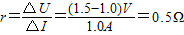 由闭合电路欧姆定律E=U+Ir可知,U=E-rI,因此当干路电流为零时的路端电压为电动势,图线的斜率为电源的内阻,由此可知,E=1.5V,