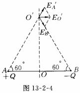 如图13-2-2所示,真空中,带电量分别为+Q和-Q的点电荷A、B相距r,则:(1)两点电荷连线的中点O的场强多大?(2)距A、B两点都为r的O′点的场强如何?