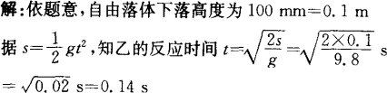 两个同学在一起测量各自的反应时间.甲同学拿着把300 mm长的尺子竖直放置,尺的零刻度端在下;乙同学的手放在尺的零刻度处准备听到口令后就抓住尺子,假如乙同学听到口令后抓住了尺子的100 mm刻度处,请计算出乙的反应时间.