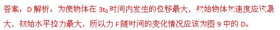 力F,使物体在水平面上运动了3t0的时间。为使物体在3t0时间内发生的位移最大,力F随时间的变化情况应该为图9中的哪一个?( )