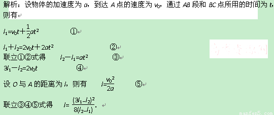 (18分)已知O、A、B、C为同一直线上的四点、AB间的距离为l1,BC间的距离为l2,一物体自O点由静止出发,沿此直线做匀速运动,依次经过A、B、C三点,已知物体通过AB段与BC段所用的时间相等。求O与A的距离.