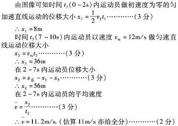 到达终点之前速度己达到最大.如图所示,记录的是该运动员在比赛中的v-t图像,其中时间t1(0~2s)和时间t3(7~10s)内对应的图线均可视为直线,时间t2(2~7s)内对应的图线为曲线,试求运动员在时间t2(2~7s)内的平均速度的大小.![]()